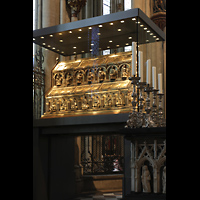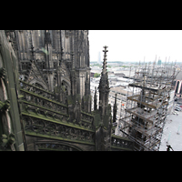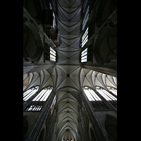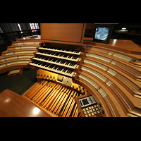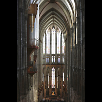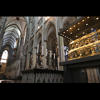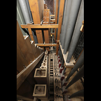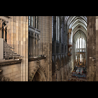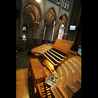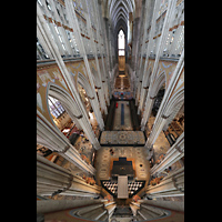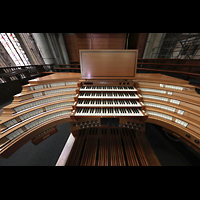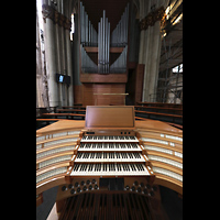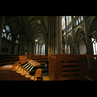 Blick vom südöstlichen Triforium auf die Querhausorgel und den Zentralspieltisch |