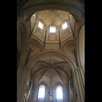 Blick ins Vierungsgewölbe und in den Chorraum und bunte Glasfenster im Querhaus |