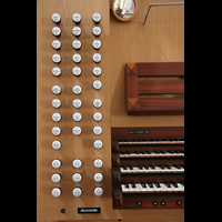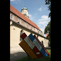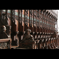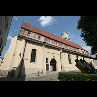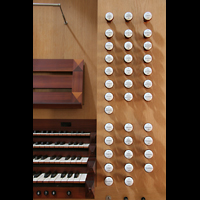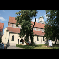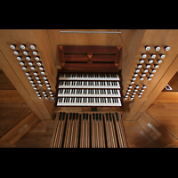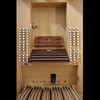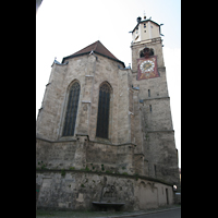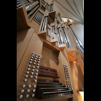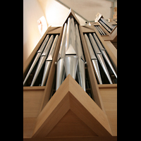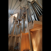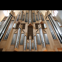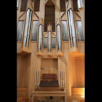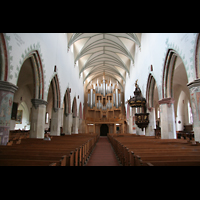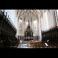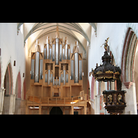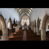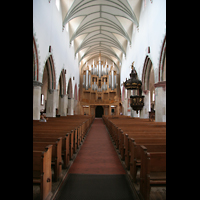 Blick ins Gewölbe mit Orgel und romanischem Kruzifix im Chor |