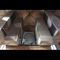 Blick von der Orgelempore zwischen den Orgeltürmen in die Kirche |