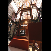 Chororgel mit Spieltisch und Blick ins Gewölbe; links oben am Gerüst die neue Balkonorgel Süd (2023) |