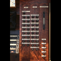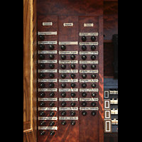 Rechte Registerstaffel des mechanischen Spielschranks der Hauptorgel |