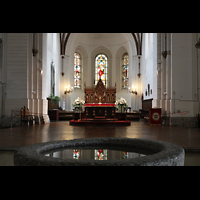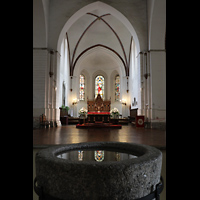 Blick über den Taufstein aus dem 12. Jh. in den Chorraum mit Hauptaltar |