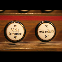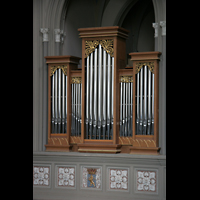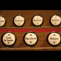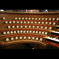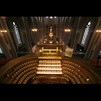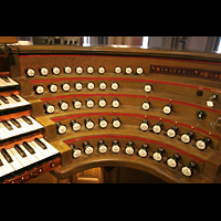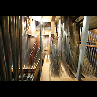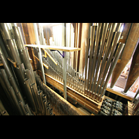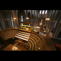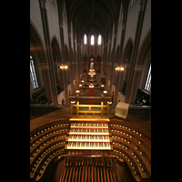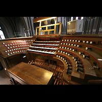 Seitlicher Blick über den Spieltisch auf die Orgel |