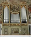2 Manuale, 23 Ranks, 20 Register (+ 3 Tr.) 1868 erbaut von Matthäus Mauracher (A, Salzburg) 1876 wurde durch die Verwendung minderwertigem Materials (das ursprünglich für andere Projekte gedacht war) bereits eine grundlegende Reparatur notwendig, durchgeführt von Mauracher 1887 Umbau der Mechanik und des Spieltischs sowie Umdisponierung (Einbau von Salicional und Dulciana) durch Albert Mauracher 1901 erbeute Reparatur durch Albert Mauracher 1910 war die orgel fast unspielbar geworden. Erneute Reparatur 1917 Reparatur 1918 Zwangsabgabe der Prospektpfeifen zu Kriegszwecken 1926 Reparatur und neuer Zinkprospekt durch ? 1943 Reparatur durch Dreher & Flamm 1946 Reparatur & Reinigung durch Carl Binding 1988 Umsetzung der Orgel von der ehemals zweiten auf die nunmehr einzige, untere Empore. Dabei dilettantische "Reparatur" durch Ersatz defekter Originalteile durch Plastik-/Pressspan-Teile, ... Nach nur wenigen Jahren war diese "reparierte" Orgel wieder unspielbar geworden 2021-2022 greundlegende Restaurierung durch Karl Schuke (D, Berlin) - weitgehend erhaltene Register mit * markiert Nachdem die Orgel - teilweise aus minderwertigem Material gefertigt - immer störanfälliger wurde, entschloss man sich 1994 zu einem Neubau im alten Gehäuse |