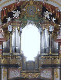 3 Manuale, 51 Ranks, 39 Register 1884 erbaut im historischen Gehäuse von ca. 1740 mit 30 Registern von Leopold Breinbauer (A, Ottensheim) 1976-1981 Teilumbau und eine Erweiterung durch die Oberösterreichische Orgelbauanstalt 2017-2018 Restaurierung mit weitgehender Rückführung auf den Originalzustand durch Kuhn (CH, Männedorf) Kegelladen mit mechanischer Spiel- und Registertraktur mit 5 festen Kombinationen (p, mf, f, ff, pleno organo) Die Stiftskirche verfügt außerdem über eine separate Chororgel mit 13 Ranks / 8 Registern auf 1 Manual und Pedal (Rummel 1746 / Kuhn 2016) |
