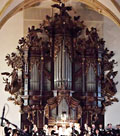 3 Manuale, 103 Ranks, 74 Register 1739-1741 erbaut von Wenzel Starck (D, Ellbogen) später mehrfach umgebaut und zeitweise auch ausgelagert 1991 Restaurierung und Wiedereinbau der alten Orgel und Erweiterung um neue Werke und einen elektrischen Zentralspieltisch, von dem aus beide Orgeln spielbar sind, durch Rieger-Kloss (CZ, Krnov) danach mehrere Reparaturen durch ? Elektropneumatische Traktur mit Setzerkombinationen und 7 festen Komnbinationen (pp, p, mf, f, ff, pleno, tutti) am mobilen neuen Spieltisch, mechanischer Spieltisch für den restaurierten alten Teil der Orgel |