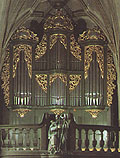 4 Manuale, 74 Ranks, 49 Register 1973 Orgelneubau im alten Gehäuse unter Wiederverwendung einiger Register auf der Orgel von 1948 durch Weigle (D, Stuttgart) 1 Register war 1986 noch vakant (*) Vorgängerorgeln: um 1670 erste Orgel im Chor von Johann Jakob Fesenbeckh (D, Stuttgart) 1767 Neubau mit 22 Registern durch Johann Sigmund Haußdörffer (D, Tübingen) - dieser stirbt jedoch kurz vor Vollendung des Werkes, so dass sein Schwiegersohn Hand-Rüdiger (Rudigier)die Orgel fertigstellt 1914 Einbau eines pneumatischen Werks mit 32 Registern auf 2 Manualen durch Link (D, Giengen) Umbauten und Erweiterungen 1934 und 1942 1948 Erweiterung auf 48 Register auf 3 Manualen durch ? - dabei wird das 3. Manual auf 2 neue Brüstungspositive verteilt |