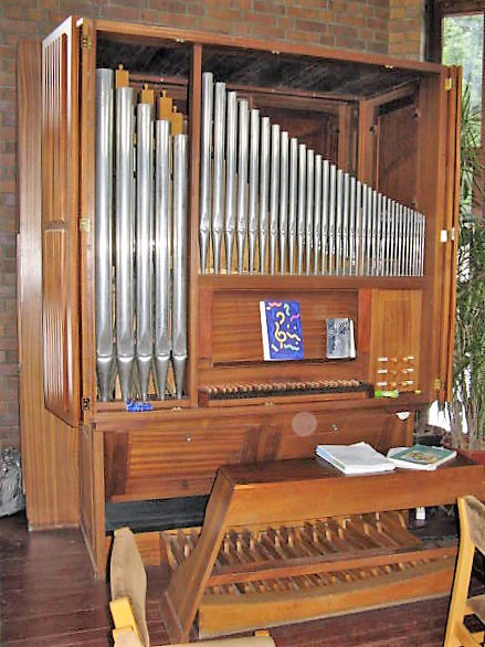 ? erbaut für eine Schule in Schwalbach am Taunusvon von Hillebrandt (D, Hannover) 1992 umgesetzt in die Kirche des Gemeindezentrums von ? Schleifladen mit mechanischer Spiel- und Registertraktur
