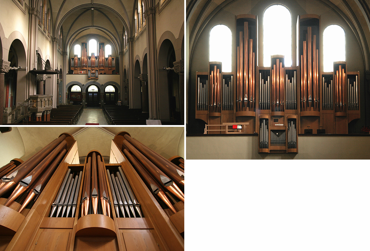 I. Rückpositiv | 15 (9) | II. Hauptwerk | 18 (12) | III. Schwellwerk | 17 (12) | Pedal | 15 (10) | |||||||||||||||