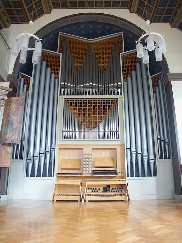 Große Orgel in der Aula perspektivisch mit zwei Spieltischen