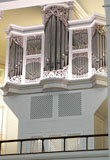 4 Manuale, 69 Ranks, 52 Register (+ 2 Sonst.) 1951 erbaut als opus 1 von Rudolf von Beckerath (D, Hamburg) - zunächst mit 11 Registern auf 2 Manualen und Pedal (geplant waren 27 Register) 1956 Erweiterung auf 18 Register durch Beckerath 1976 Elektrifizierung der Registertraktur, neuer Spieltisch, Einbau eines Schwellers im BW und Ergänzung um einen Tremulanten 1983 Einbau von Setzern 1999 Generalüberholung 2020 Generalüberholung, Rückbau des Origianlcorpus, Erweiterung um ein Schwellwerk und Fernwerk, Elektrifizierung und Digitalisierung der gesamten Anlage, neuer Doppelspieltisch Schleifladen mit elektrischer Spiel- und Registertraktur, Setzer, Crescendopedal, freie Zuordnung der Werke und Manuale, MIDI, steuerbar per WLAN/Tablet Besonderheiten: Doppelspieltisch: Eine Seite 2-manualig mechanisch (Original 1951), 2. Seite elektrisch digital; Pedal an jedes Manual koppelbar |