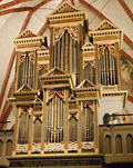 2 Manuale, 19 Ranks, 16 Register (+ 2 Tr.) 1980-1982 erbaut im hstorischen Gehäuse aus dem 16. Jh. von den Gebr. Hillebrand 2014 Ersatz einiger Pedalregister (mit * markiert) und Neuuintonation in stärkerer Anlehnung an Klangparameter des 16. Jh. durch Hillebrand Schleifladen mit mechanischer Spiel- und Registertraktur; modifiziert mitteltönige Stimmung, Stimmtonhöhe ca. 1/2 Ton höer als normal. + Tremulant (2014) auf das ganze Werk? Vorgängerorgeln: Im 16. Jh. erbaut von ? - erhalten sind Gehäuse und Prospektpfeifen 1638 weitgehende Zerstörung im 30-jährigen Krieg 1666-1669 Quasi-Neubau im alten Gehäuse durch Justus Kayser (D, Celle) 1868 Reparatur und Dispositionsänderung durch Balthasar Heldt 1695-1868 diverse kleinere Reparaturen durch verschiedene orgelbauer 1900 Neubau hinter dem historischen Prospekt durch Furtwängler & Hammer |
