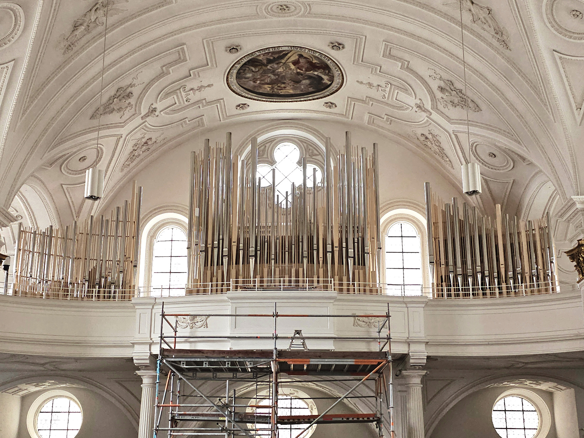 Blick vom Solowerk durch die Säulen des Hochaltars auf die Hauptorgel Photo: © Martin Doering