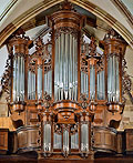 3 Manuale, 46 Ranks, 39 Register 1763-1766 erbaut im bereits vorhandenen Gehäuse von 1751 durch Louis Dubois (F, Kaysersberg) 1835 Reparatur (Ersatz von 112 abhandengekommenen Pfeifen) durch Georg Wegmann (F, Strasbourg) 1862 Umbau (neue Bälge, Ersatz einiger Aliquote und Mixturen durch romantische Register) durch Xavier und Ferdinand Stiehr (F, Seltz) 1917 Zwangsabgabe der Prospektpfeifen zu Kriegszwecken 1928 Ersatz der fehlenden Prospektpfeifen und geringfügiger Umbau durch Franz Kriess (Molsheim) 2010-2012 grundlegende Restaurierung durch Gaston Kern (F, Strasbourg) - rekonstruierte Register mit * gekennzeichnet + Tremblant fort + Tremblant doux (auf das ganze Werk?), + Tremblant Voix humaine. Tiefstgestimmte Orgel Frankreichs mit a'=370 Hz Vorgängerorgel: Erste Orgeln (Schwalbennester) im 15. Jh. 1525 neue Orgel von Johann Ludwig Wiegand 1751 Beginn des Baus der großen Orgel durch Johann Friedrich Alffermann und seinen Söhnen (D, Landau), die beim Tod des Orgelbauers 1757 noch ein unspielbarer Torso war 1759-1763 Weiterbau durch Johann Friedrich Eggers, der sich mit dem Auftrag offenbar übernommen hatte - die Orgel blieb ein Torso: Gerade 8 Register funktionierten mangelhaft... |