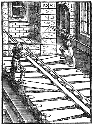 Die für das Erklingen der Pfeifen nötige Luft (im Orgelbau Wind genannt) wurde früher durch Balgtreter erzeugt, die in einer Nachbarkammer der Orgel große Bälge getreten haben, wie in nebenstehender Skizze dargestellt ist. Der Wind wurde gesammelt in die Reservoire der Orgel geleitet. Heutzutage übernimmt ein Gebläse, das von einem großen Elektromotor angetrieben wird, diese Arbeit - das Prinzip ist aber immer noch das gleiche. Damit sich ein stabiler Ton ergibt, muss der Winddruck möglichst konstant sein. Da sich aber die von der Orgel geforderte Windmenge, die abhängig ist von der Anzahl der gezogenen Register und gespielten Töne, laufend ändert, besitzt die Orgel große Reservoire und Ausgleichseinrichtungen (so genannte "Schwimmerausgleichsbälge" unter den Windladen), die dafür sorgen, dass der Winddruck konstant bleibt. Mit diesem System ist es auch möglich, unterschiedliche Winddrücke für die verschiedenen Werke, Teilwerke oder sogar für einzelne Register zu realisieren. Ein höherer Winddruck erzeugt einen lauteren und fülligeren, aber oberton- ärmeren Ton (mit der gleichen Pfeife) als ein niedrigerer Winddruck, d.h. man kann durch eine unterschiedliche Einstellung des Winddrucks auch eine klangliche Differenzierung der einzelnen Teilwere erreichen. Normal sind Winddrücke von etwa 60 bis 100 mm WS (Wassersäule in der sog. Windwaage gemessen), was etwa 2,4 bis 4" (inch) entspricht. Hochdruck-Register können mit Winddrücken bis zu 2.500 mm (ca. 100") betrieben werden - allerdings klingt ein so erzeugter Ton dann eher nach Schiffshorn oder Sirene als nach einem Orgelregister... Ein wichtiges Hilfsmittel, um den Orgelklang weniger statisch wirken zu lassen, ist neben dem oben beschriebenen Schweller der Tremulant. Der Tremulant öffnet und schließt den Windkanal an einer kleinen Stelle periodisch und erzeugt so Winddruckschwankungen, die wiederum ein "Tremulieren" des Tons bewirken. In nebenstehendem Klangbeispiel ist eine "Vox humana" mit Tremulant zu hören: ![]() Zu guter Letzt: Wem die Infos auf dieser Seite noch nicht ausreichen, sollte sich auch im Orgel-Bereich der kostenlosen Online-Bibliothek Wikipedia umschauen. |