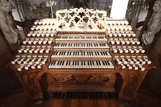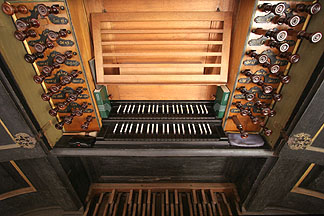 Spieltisch der Brandenburger Domorgel (1725) mit ausziehbaren Registerzügen links und rechts. Hier erkennt man außerdem eine Eigenart vieler Orgel-Spieltische: Die Tasten sind umgekehrt gefärbt wie beim Klavier (ganze Töne schwarz, halbe Töne weiß). |