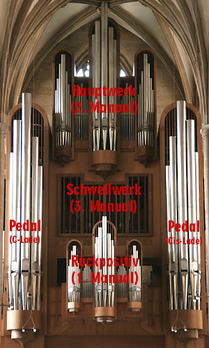 dazu, jeweils mit weiteren Manualen verbunden. Große Orgeln verfügten somit über 3 bis 4 Manuale; die größten Orgeln heutzutage besitzen bis zu 7 Manuale. Jedes Werk erhielt verschiedene Register, d.h. Pfeifenreihen unterschiedlicher Bauart, die jeweils verschiedene Klangfarben erzeugen konnten. Die Aufstellung der Pfeifenreihen (Register) einer Orgel nennt man Disposition. Die verschiedenen Werke wurden klanglich unterschiedlich ausgelegt, indem man sie unterschiedlich disponierte: Das Hauptwerk sollte als Rückgrat der Orgel einen majestätischen Klang haben, das Rückpositiv hatte meist einen helleren Klang und war mit zusätzlichen Solostimmen versehen. Dem Pedalwerk ordnete man die Bassstimmen zu. Dieses so genannte Werkprinzip gilt zumeist heute noch, wie man beispielsweise an der Erfurter Domorgel (Abb. links) erkennen kann: