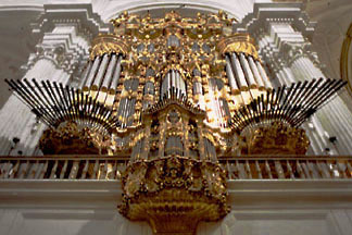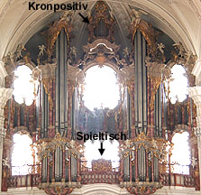 Weingartener Basilika (1750). Der Spieltisch steht frei, so dass der Organist in den Kirchenraum blicken kann. Dies war damals eine Neuheit und technische Meisterleistung, da alle 6.631 Pfeifen bis zu 20 Meter entfernt sogar um Ecken herum mechanisch anpielbar sein mussten. |