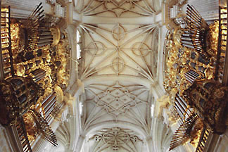 Eine klassische spanische Orgel (18. Jahrhundert) in der Kathedrale von Granada mit ihren charakteristischen spanischen Horizontaltrompeten. In Spanien waren damals Doppelorgeln mit einem Doppelprospekt üblich: Die Orgeln standen sich gegenüber und hatten jeweils eine Prospektseite nach vorne zum Hauptschiff (siehe Fotos) und eine nach hinten zum Seitenschiff. Beide Orgeln sind jeweils über einen eigenen Spieltisch (Erläuterung hier) unabhängig voneinander spielbar. |