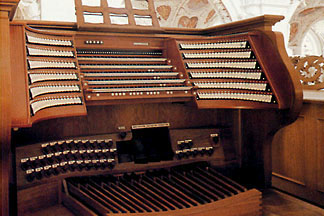 Der Spieltisch ist die Steuerzentrale einer Orgel und beinhaltet die Klaviaturen (Manuale und Pedal). Links und rechts neben den Manualen sind die Registerzüge angebracht, mit denen die einzelnen Pfeifenreihen (d.h. Klangfarben) ausgewählt werden. Bei historischen Orgeln sind sie grundsätzlich als mechanische Züge ausgeführt, bei den meisten modernen Orgeln als elektrische Wippschalter, verbunden mit der Möglichkeit, Registerkombinationen vorzuprogrammieren und auf Knopfdruck abzurufen (Erläuterung hier). Außerdem beinhaltet der Spieltisch die so genannten Spielhilfen wie Koppeln, Schweller, usw. (Erläuterung hier). |