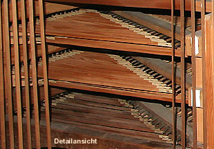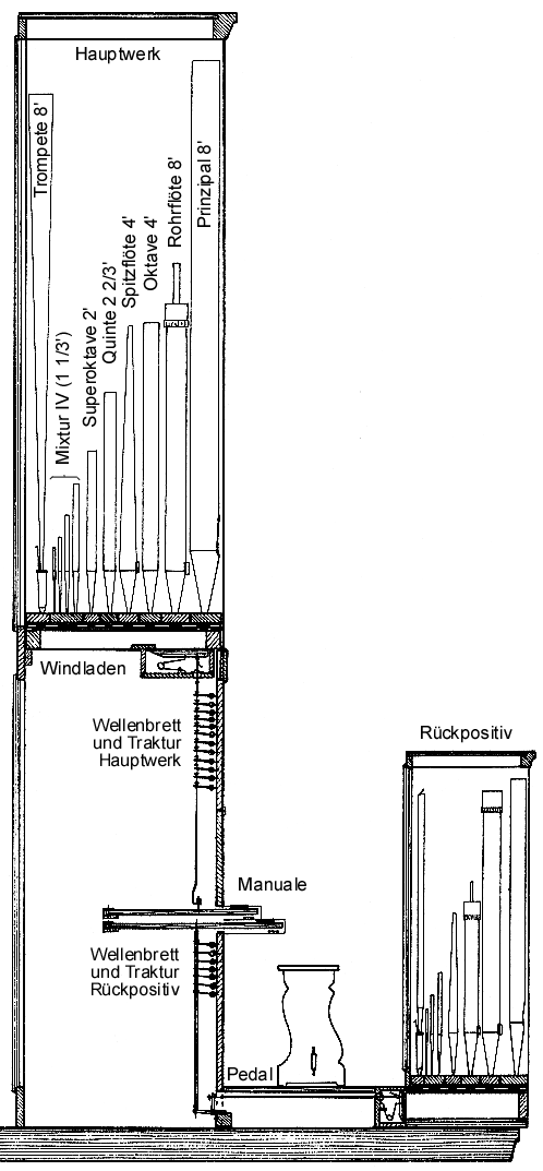 (mixturenbetonten) Klang barocker Orgeln. Moderne Orgeln heutzutage versuchen, beide Stilepochen und Klangideale miteinander zu verbinden, d.h. einer barocken Basis gemäß Werkprinzip werden romantische Register oder bei großen Orgeln sogar ganze Werke (meistens Schwellwerke) roman- tischer Bauart hinzugefügt, so dass die Interpretation aller Musikrichtungen möglich wird. Die nebenstehende Abbildung zeigt eine einfache 2-manualige Orgel mit Hauptwerk und Rückpositiv. Man erkennt die nach oben und unten von den Manualen abgehende mechanische Traktur mit den Wellenbrettern, die die Verbindung von den Tasten der Klaviaturen zu den Tonventilen der Windladen herstellen (Erläuterung hier), auf denen die Pfeifen in Reihen stehen. Anhand der unterschiedlichen Pfeifenformen in der Skizze erkennt man auch die Disposition der Orgel: Von links (in der Orgel hinten) nach rechts (im Orgelprospekt vorn) gesehen stehen im Hauptwerk:Erläuterungen zu den Fußzahlen und Tonhöhen stehen hier; die verschiedenen Pfeifenarten und Register werden mit Klangbeispielen hier beschrieben. Von allen in einer Orgel vorhandenen Pfeifen stehen nur wenige sichtbar im Prospekt. Die meisten Pfeifen stehen unsichtbar dahinter, wie man in der Skizze rechts und auf den Fotos unten sehen kann. Im Prospekt stehen meist nur die Prinzipale (die zylindrischen polierten Zinnpfeifen, siehe Fotos), während die aufgrund ihrer Bauart nicht ganz so attraktiv aussehenden anderen Pfeifen unsichtbar dahinter stehen. Bei einigen – meist größeren – Orgeln findet man im Prospekt auch horizontal herausragende Pfeifen, so genannte Spanische Trompeten. Der Name erklärt sich dadurch, dass in Spanien und Portugal schon im 16. Jahrhundert Trompetenregister horizontal in den Prospekt gesetzt wurden. Durch ihre trichterförmigen Schallbecher sehen diese Pfeifenreihen nicht nur imposant aus, sondern beherrschen durch ihre Lautstärke auch den Klang der gesamten Orgel. |