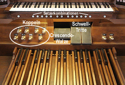 Die Spielhilfen Orgeln bieten je nach Ausstattung noch so genannte Spielhilfen an. Dazu gehören z.B. Creszendowalze, Koppeln und Schweller. Eine Crescendowalze (auch "Registerschweller" genannt) ist eine drehbare Fußrolle, die durch Vorwärts- oder Rückwärtsdrehung Register in vorher festgelegter Reihenfolge hinzuzieht oder abstößt. Dies ist besonders zur Interpretation romantischer Orgelwerke ein wesentliches Hilfsmittel. Die Koppeln sind eine Einrichtung, die entweder mechanisch, pneumatisch oder elektrisch mehrere Klaviaturen aneinanderkoppeln, d.h. durch Drücken der Tasten der einen Klaviatur werden gleichzeitig die Tasten der angekoppelten Klaviatur mitgedrückt und deren Pfeifen mitgespielt. Bei rein mechanischen Orgeln geschieht dies tatsächlich so (mit dem damit verbundenen doppelt so schweren Tastendruck), bei elektrischen Koppeln werden nur die Töne mitgespielt, ohne die Tasten des angekoppelten Manuals zu bewegen, d.h. der Spieler merkt die Koppel praktisch nicht. |