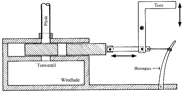 entwickelt. Hierbei setzt der Tastendruck eine Pneumatik (Druckluftmechanismus) in Gang, die durch Röhren / Schläuche mit dem entsprechenden Tonventil unter der Pfeife verbunden ist und
