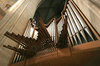 Spanische Trompeten (Tuba 16', 8' und 4') der Orgel im Ulmer Münster mit Prinzipal 16' des Hauptwerks. Allein dieses eine Teilwerk dieser Riesenorgel ist größer als die meisten anderen Orgeln komplett. |