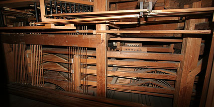 Im Prinzip sieht es hinter dem Spieltisch jeder Orgel mit mechanischer Spieltraktur ähnlich aus (wenn auch nicht ganz so kompliziert). |