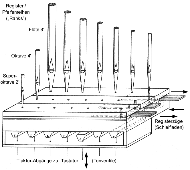 Hinweise: Die Zeichnungen auf dieser Seite sind Scans aus dem Buch "Die Orgel" von Friedrich Jacob (Schott Verlag), die textlichen Ergänzungen in den Skizzen stammen von mir. Die Skizzen können durch Anklicken vergößert werden. Die Klangbeispiele stammen von der CD "Das Geheimnis Orgel", gespielt von Paul Wißkirchen an der Altenberger Domorgel mit freundlicher Genehmigung der TMK-Gruppe Medienproduktion & Vertrieb, Köln. |