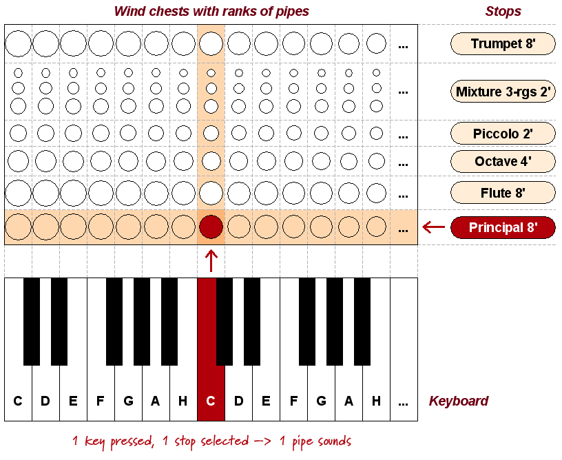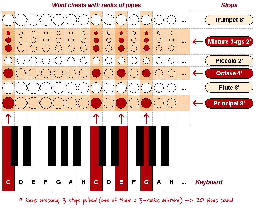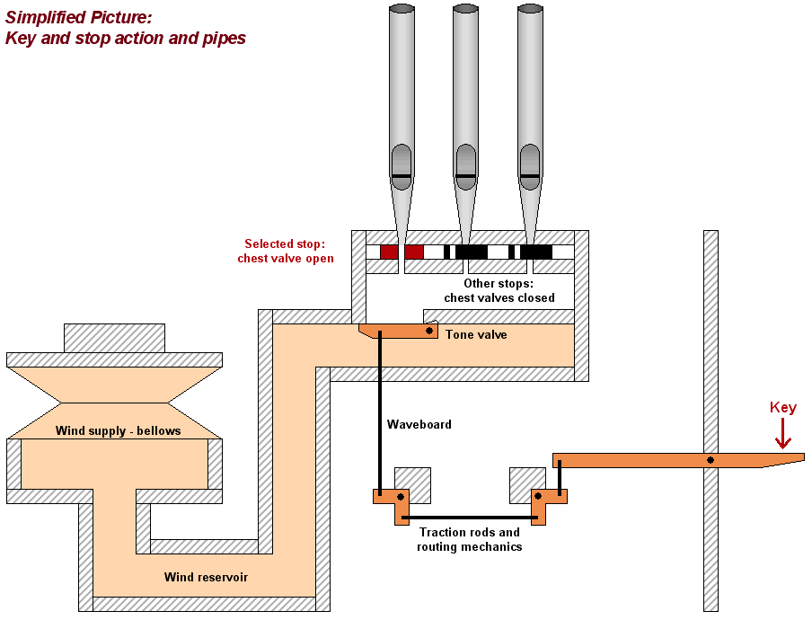 Diagrams / pictures added in section "How organs work": • Special aids • Key and stop action matrix (one key / stop) • Key and stop action matrix (several keys / stops) • The mechanics of the keys and pipes Dictionary of the most frequently used organ stops added |