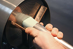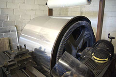When the metal sheet has cooled down it is attached to a large rotating drum and dressed to the desired thickness or planed
