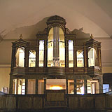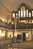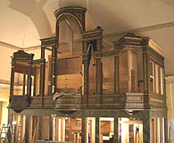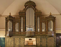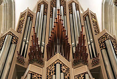 acoustics of the place of destination. The voicer's work is crucial to the sound quality of the new organ. After or together with the voicing the final tuning is done. Depending on the size of the instrument (a few hundred to many thousand pipes!) these works may take something between a few weeks and several months. The picture on the left shows the completed organ of the Johannis Church at Frankfurt-Bornheim. All in all this relatively small organ contains more than 30,000 individual parts, including some 2,000 pipes. |