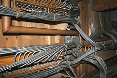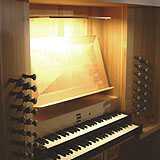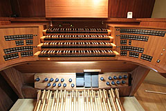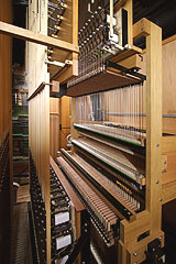 Today most organs are constructed with a mechanical key action (= connection between the keys and the pipe pallets) and an electric stop action (connection between the drawknobs / stop tabs and the stops. This combines the advantages of a sensitive play (mechanics) with the opportunity to save thousands of combinations of stops (mixtures of sound) and completely change the registration by just pushing a button. The "pulling" of the stops is then accomplished via an electromagnet. The memories for combinations have to be programmed beforehand, i.e. adapted to the specific organ and its stoplist (= the list of all stops / rows of pipes included in the organ). |