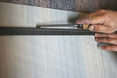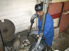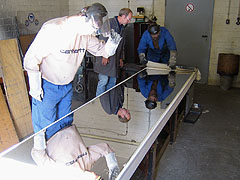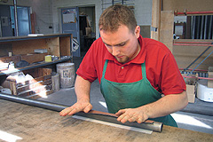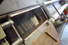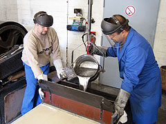 of the alloy may also depend on the intended sound. Casting the metal pipe starts with melting the tin and lead ingots for the respective alloy at a temperature of up to 350°C (660°F) in a large melting pot. Then the molten metal is poured into the casting box and pushed along the casting bench. The liquid alloy is discharged from a slot in the back of the casting box and spreads evenly over the casting bench. |