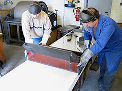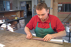 on a horizontal planing bench. After planing the metal sheets have to rest for some time to reduce tension. Then they can be cut to the shape of the desired pipes. On the cutting table both the cylindrical pipe body as well as the conical pipe foot are cut from the metal sheet. |