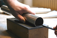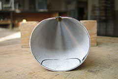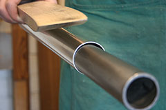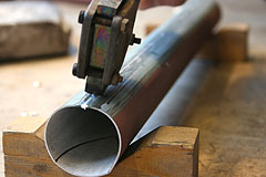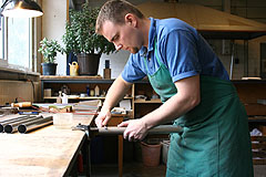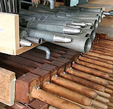 Then work advances to the next level: The parts are rounded. First the metal sheets are rolled up around cylindrical or tapered mandrels of different diameters so that you have cylinders that are open to the small sides, curved to different degrees to form the different pipe bodies and feet (after all, there are to be pipes of different diameters or "scales"). Then the pipe is painted with a protective color, beveled on the open longitudinal edge and soldered. After that the pipes and feet are put back on the metal cylinders and cones and rounded with a mallet. |