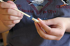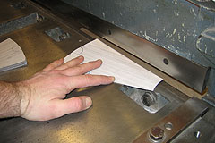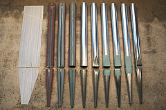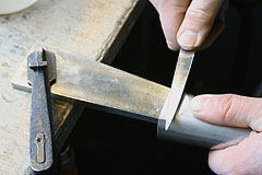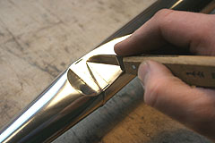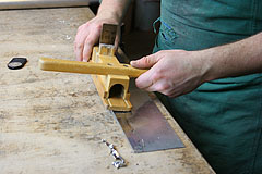 The following step is the forming of the labia. The labium is a "dent" above and below the mouth, and behind this mouth you have the languid (c.f. Varieties of pipes for a diagram). When the pipe is blown the wind issues from the slit-like flue at the base of the mouth of the pipe and hits the labium. There it generates a vibration of the air column in the pipe body. The dimensions of the labia, the languid, the flue and the cut-up are the main determinants of the sound the pipe is going to produce. |