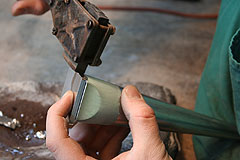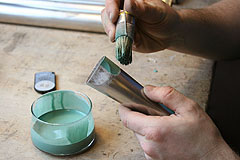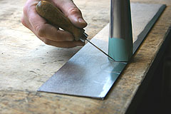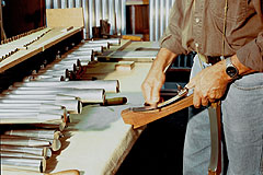 Then the unfinished pipes are painted with a protective color. For the languids metal plates are first fined down, then the languids are cut from them. When they are cut they are soldered on to the pipe foot, planed and soldered to the pipe body. The next to last step is the cutting of the upper slit (the slit above the languid. Finally the pipes are cleaned and, if need be, polished. |