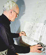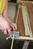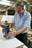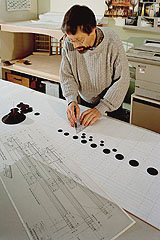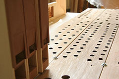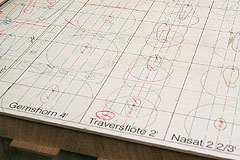 the pipe that generates the pitch corresponding to the key pressed on the console (cf. How organs work). In a first step the windchests are constructed according to the construction plans and to the position of the pipe ranks. There results a frame, subdivided by several soundboards and bonded with a pallet board on the bottom and the so-called table on the top. Then the slits for the pallets are cut. When the chest is turned around the sliders and the guides are screwed onto the table. Then the toeboard, the sliders and the table are drilled all in one, so that later on, when the sliders are moved the holes will align. Later on, the sliders will be guided by the slider guides (cf. Cross section of a slider chest). When the pipes are sketched the toeboards are drilled. After drilling the boards are bonded and the drill holes are given a countersink and burnt, so that certain substances contained in the wood will not damage the pipe feet resting on them. Once the windchest is completed with all pallets, sliders, slider guides and the bellows control, a rackboard with rack pins is added to the top of the chest that will keep the pipes from falling down. The picture to the right shows the first step: Planning the position of the pipes on the windchest and marking the drillings and reamings. |