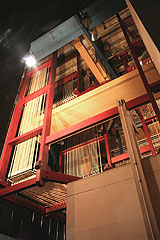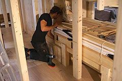 Preparing the floor | Hoisting the parts to the gallery | Case sub-frame | Installed roller board |