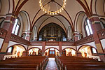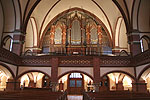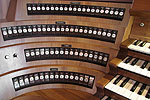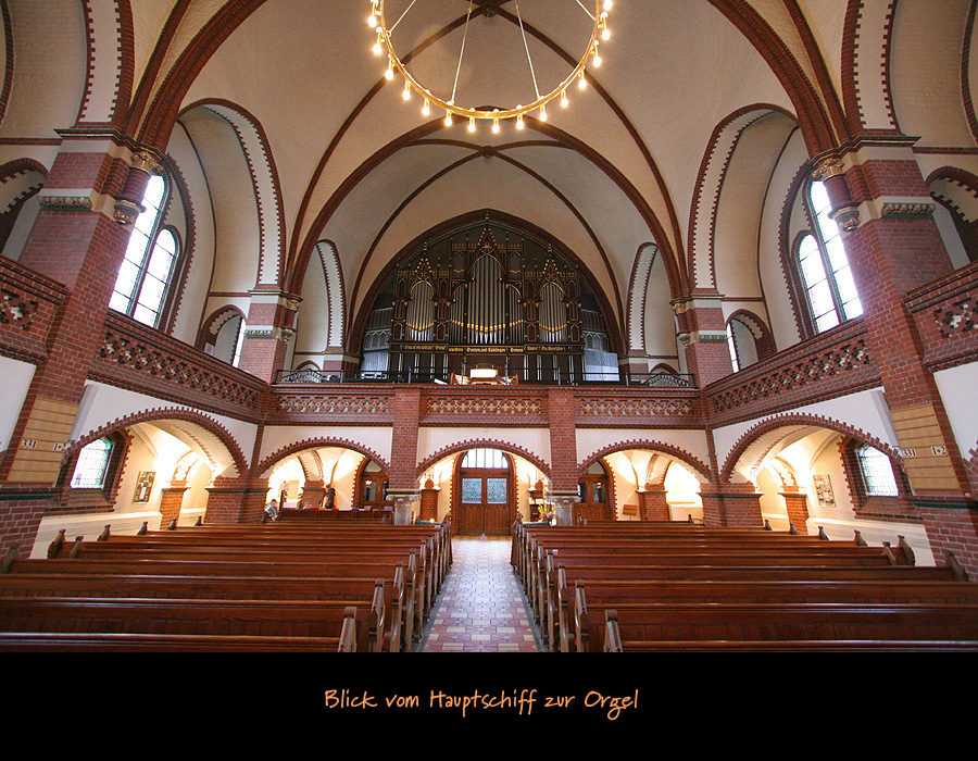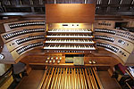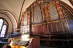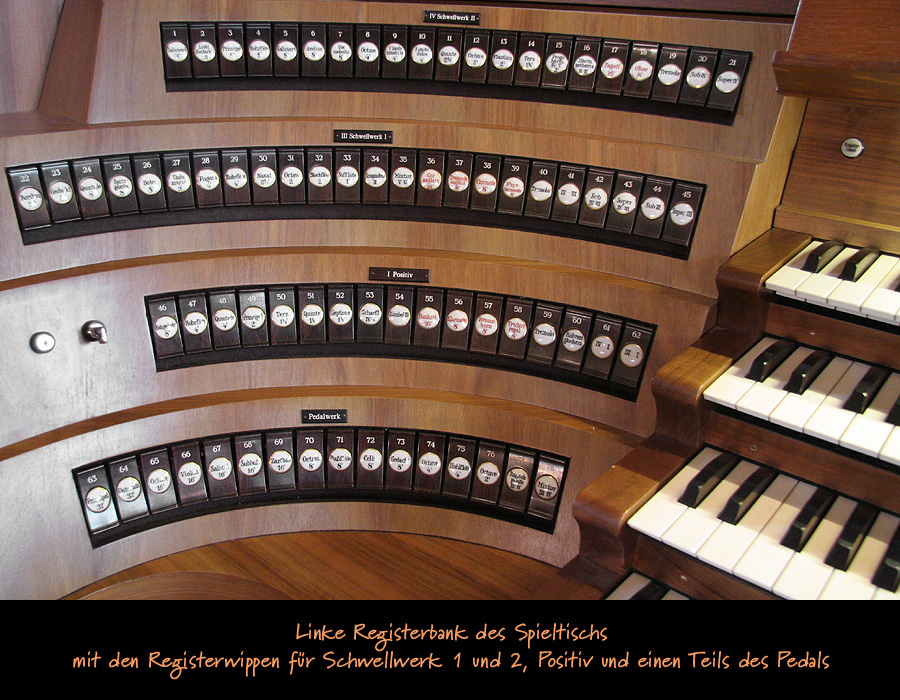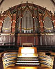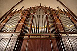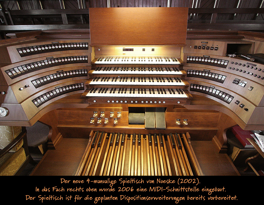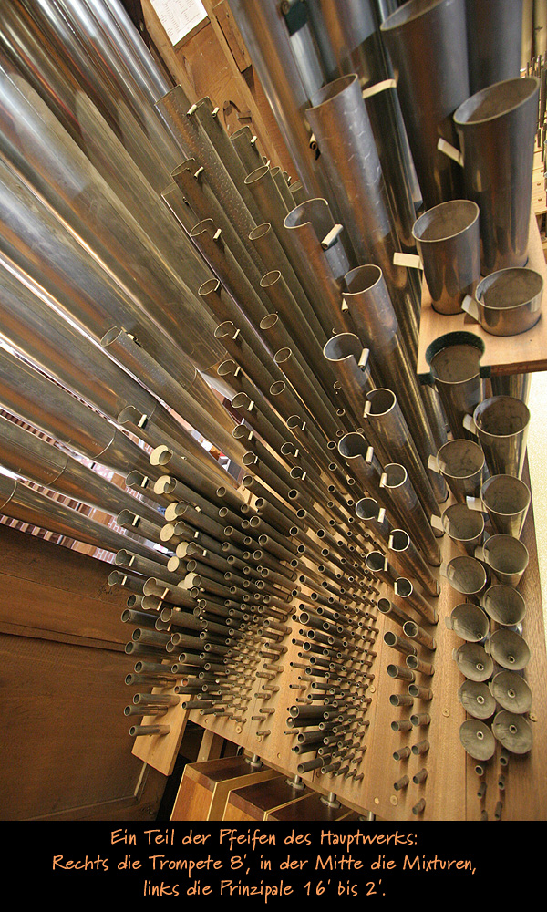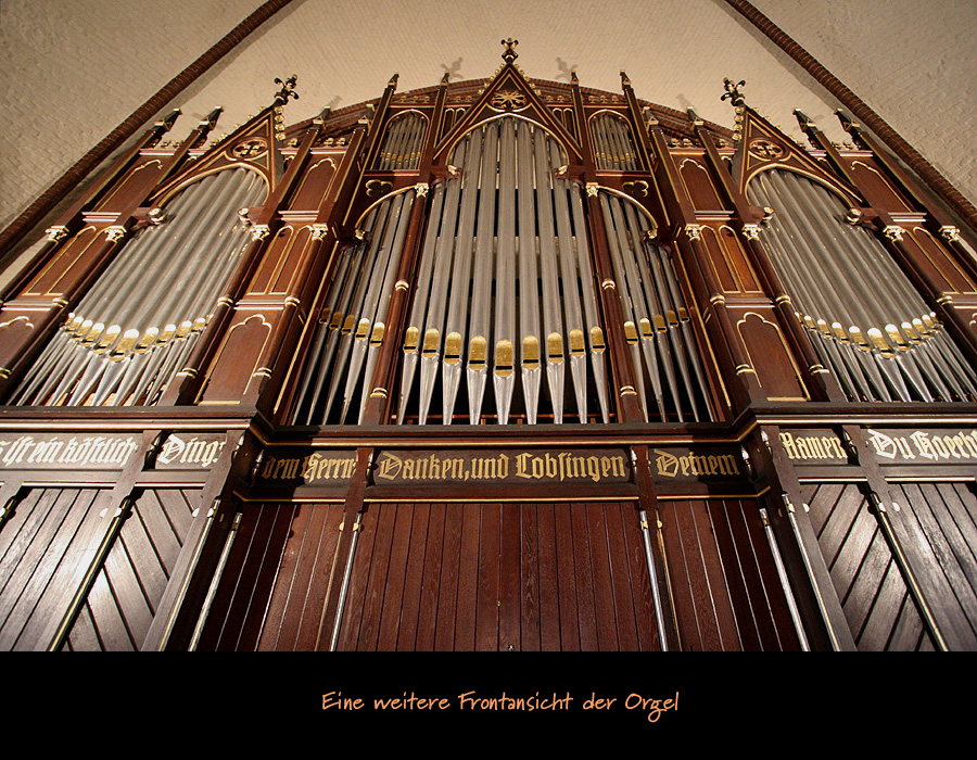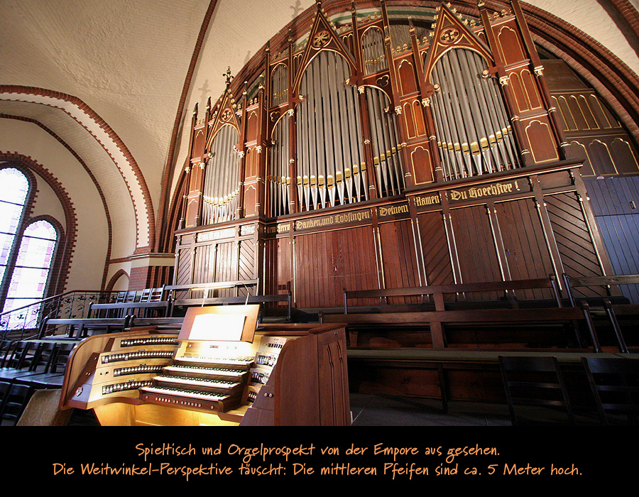 The great Auenkirche organ presently has 117 ranks with 79 voices/registers and 3 transmissions on 4 manuals and pedal. When this last enlargement is completed it should have 121 ranks with 83 voices/registers, 1 extension and 4 transmissions. This would make it Berlin's second largest organ (next to the Berlin Cathedral organ). è Complete stoplist (will open up in a separate window). |